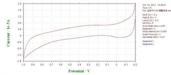 刚接触电化学,分别将纳米Pd和Pt同GE负载后做成电极,玻C电极作为工作电极,在1MH2SO4溶液中扫出来的CV曲线是下面这样的,不能理解为什么是这样的,什么峰都没有,换成在0.5M甲酸+1MH2SO4中扫CV曲线也是。所有的曲线里的参数设置见第二张图右边的。两种纳米材料的合成里都用到了PVP,难道说是因为它的影响吗,还是GE表面压根就没负载上纳米材料,还是电化学工作站上的某个设置上有问题吗,急盼回复啊 (我用的是Ag/AgCl参比电极 对电极是Pt电极,工作电极是玻C电极)