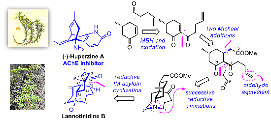 南京大学化学化工学院姚祝军教授指导的研究组最近针对huperzine A、Lannotinidine B等石松生物碱开展了系统的化学合成研究,并取得了重要进展。该实验实研究人员针对这些天然产物的个体特点分别设计了合成路线,并从中发现和获得了一些行之有效的立体控制和区域控制的高效率有机合成方法。2012年年初,该研究组博士生丁小华等首次实现了高光学纯度天然石杉碱甲的催化不对称形式合成,通过多功能有机小分子催化一锅构建了石杉碱甲结构中的复杂复杂桥环体系,在克级规模的实验中获得产品达到了95% ee的光学纯度 (Ding, X.-H.; et al. Tetrahedron 2012, 68, 6240-6248)。与此同时,该实验室的访问学者、本校生命科学院副教授戈惠明博士和化院博士研究生张兰德等在另一复杂石松生物碱Lannotinidine B的全合成中也取得了重要进展。今年8月初,他们完成的首例Lannotinidine B的全合成在国际重要学术刊物《美国化学会志》(JACS)上正式发表 (Ge, H. M.; et al. J. Am. Chem. Soc. 2012, 134, 12323-12325.)。该合成路线设计精巧,从商品化原料出发仅使用了十步化学反应,总产率达到23%。合成过程中有效利用了有关化学反应的区域选择性和立体选择性,没有一次使用保护基,并发展应用了羰基-酯基之间直接形成C-C键的自由基还原/负离子环合方法。