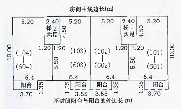 下图所示为一普通住宅楼,全幢共有6层,分为两个单元,每单元有两套住宅,全幢共24户住宅,各层套型相同,具体尺寸见图。图中所注尺寸除阳台为外尺寸外,其他尺寸均为中线尺寸,墙体厚度为0.3m。试进行套内面积、分摊面积、产权面积并计算504室的得房率。 题目附图.jpg |