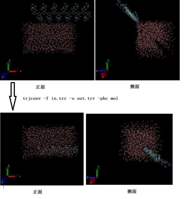 想把分子移到水盒子内部,用这个命令 trjconv -f in.trr -s topol.tpr -pbc mol -center -o out.trr 单分子还是有露在box外面的部分,请问如何把分子全都整进去啊?请说详细点儿,谢谢! 之前发了个求助帖子,但后来不能网上传图了,不够形象,现在配上图,麻烦高手回复一下,谢谢! tu.jpg |