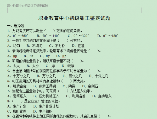 【真题资源】职业教育中心初级钳工鉴定试题及答案
