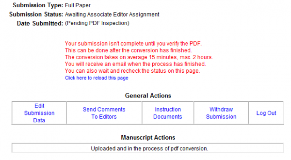 | 通过Writetrack 向AIAA的Journal of Guidance, Control, and Dynamics期刊投了一篇文章,是word格式,上传后一直处于PDF转换过程中,已经4、5天了,询问编辑,无回复,不知该怎么弄,求助,谢谢。 |