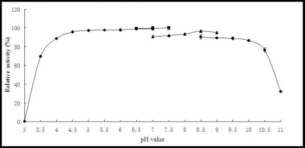 ÏÈ×ö´ÖøҺpHÎȶ¨ÐÔµÄʵÑ飬ȷ¶¨ÁËÎȶ¨·¶Î§Ö®ºóÔÙÑ¡Ôñ²ãÎöÖù¡£ Effect of pH and temperature on glucoamylase activity and stability The effect of pH on glucoamylase activity is measuring glucoamylase activity at different pH value of pH 3.0, 3.5, 4.0, 4.5, 5.0, 5.5, 6.0, 6.5, 7.0 at 37ºC. The effect of temperature on glucoamylase activity is measuring glucoamylase activity at different temperature of 25, 30, 35, 40, 45, 50, 55 and 60ºC at optimum pH. The effect of pH on glucoamylase stability was conducted by mixing 0.1mL enzyme with 0.9mL 0.1M buffer in different pH value (The buffers used were: citrate-phosphate buffer, pH 3.0¨C7.0; sodium-phosphate buffer, pH 6.0¨C8.0; Tris-HCl buffer, pH 7.0¨C9.0; and glycine-NaOH buffer, pH 8.5¨C12.0). The mixtures were incubated at 4ºCfor 24h, and the residue enzyme activity were measured. The effect of temperature on enzyme stability was conducted by incubating enzyme at 30, 35, 40, 45, and 50ºC for 1 h, and the residue enzyme activity were measured. Each result of the character assay was showed by a scatter diagram with trend line, the highest activity was defined as 100%, other activity was defined as relative activity. The error bars represent the standard deviation of triplicate measurements. |