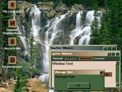 浏览网页地址:http://www.themeworld.com/cgi-bin/preview.pl/themes/ulcwatrs.zip 文件地址:http://www.themeworld.com/cgi-bi ... themes/ulcwatrs.zip 添加该主题的方法: 先点download下载,安装后: win2000:中的“桌面主题”仍然存在:单击“开始→运行”,输入“themes”,回车后就能够打开桌面主题窗口,我们可以通过单击“主题”后的下拉按钮来选择界面主题。 winxp:桌面属性里就可以改了。 ![]() ![]() ![]() ![]() ![]() [ Last edited by wang_xing11 on 2007-6-22 at 15:18 ] |