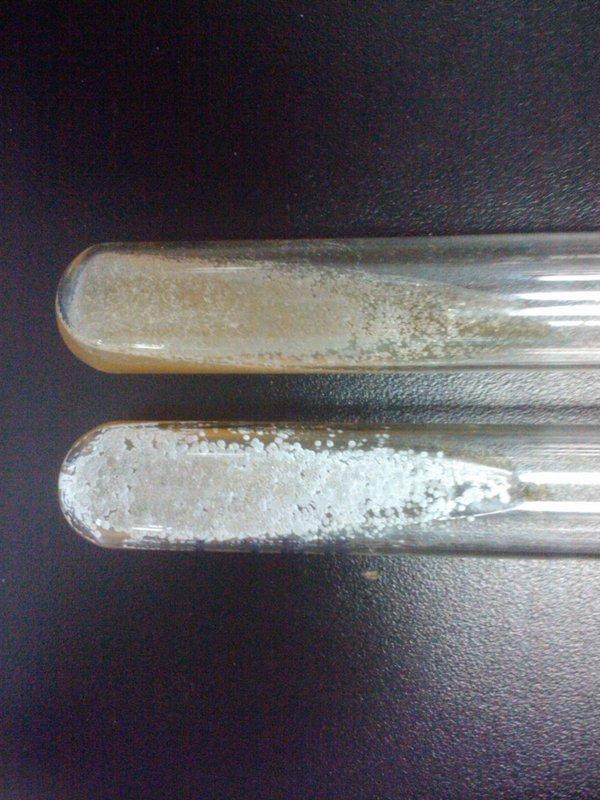 最近做菌种诱变,筛出来的菌只有一株产孢能力很强,3天就可以出孢,但是其他株一直都看不见白色粉末状的孢子,如图,有的说是斜面上菌体已经溶了,所以不产孢,但是我直接挑斜面做发酵产量都是差不多的,我想问一下大家有没有遇到过这种情况呢,应该怎么解决这个问题呢?谢谢 图 |