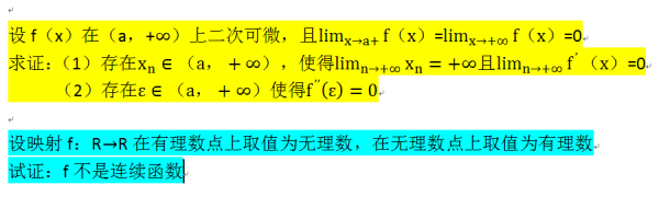 我做下第2题吧,用反证法,假设f在R上连续,(a,b)是一开区间,则f(a,b)应该是R上的一连通集合,由f在有理点取无理数,在无理点取有点理数知显然f不是常值映射,且f(a,b)只包含了可数个点,这与f(a,b)连通一定包含不可数个点矛盾。