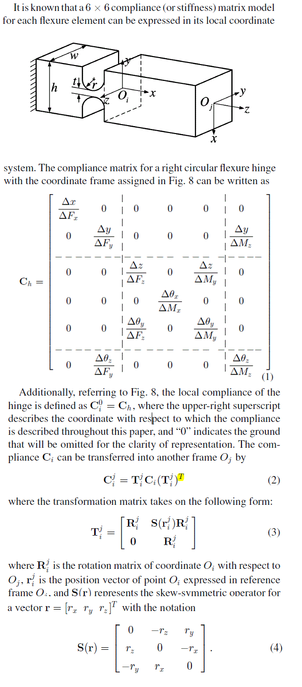上面是论文原文。我的疑问是: 当前坐标系{i}下柔度(或刚度)矩阵建立好后,要在新坐标系 {j} 下表达,要使用转换矩阵 T ,这个T 的 逆矩阵 和 转置矩阵 好像不相等啊。原文公式(高亮标出)用的是右乘 转置矩阵,我感觉应该用 逆矩阵 呀。??? 而且很多类似文献都是用 转置矩阵 。小弟百思不得其解,跪求各位大神赐教!不胜感激! |