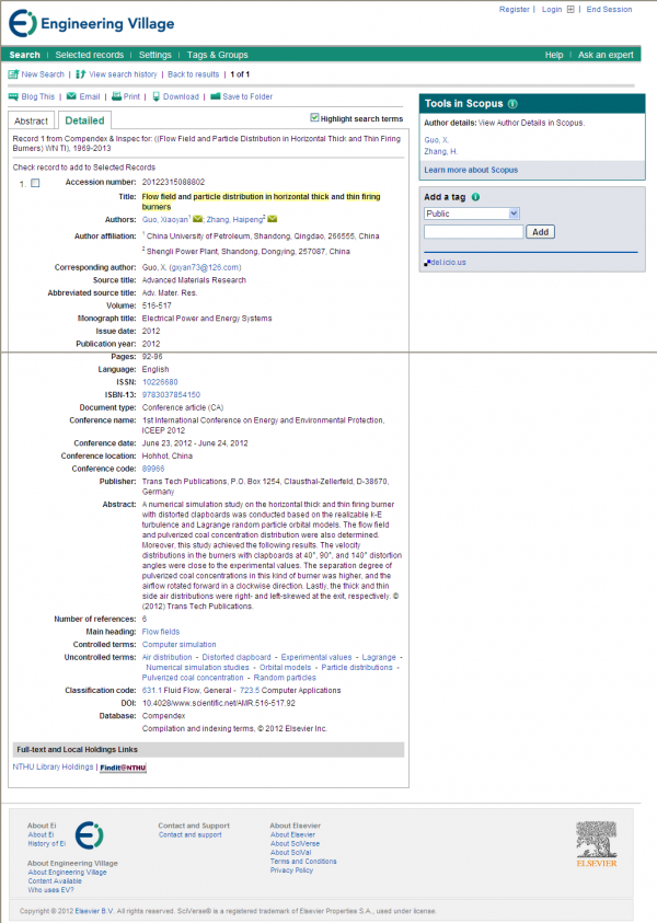 文章题目Flow Field and Particle Distribution in Horizontal Thick and Thin Firing Burners,作者Xiaoyan GUO ,帮忙查一下有没有被EI收录,不胜感激!