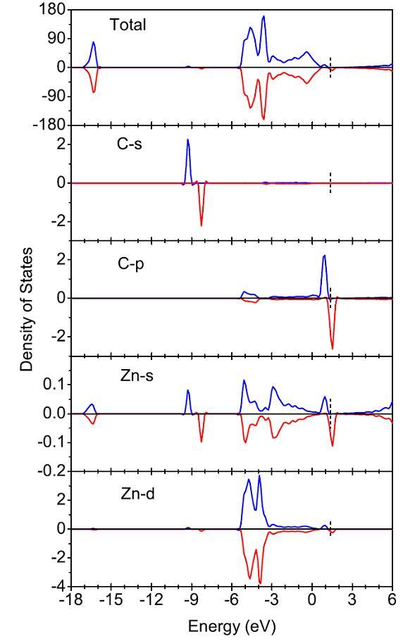 the picture shows the calculated local density of states (LDOS) for the carbon dopant and the neighboring Zn atoms. Strong coupling between the carbon s and p orbitals and the s orbital of Zn can be seen. The interaction causes the carbon 2s orbital around 9 eV and the carbon 2p orbital near 2.3 eV to split. The spin-up bands are fully occupied while the spin-down bands are partially filled, resulting in a magnetic moment of 2.02B per carbon dopant. The magnetic moment is mainly contributed by the carbon p orbitals (0.85B), while each of the neighboring Zn atoms and second nearest neighboring oxygen atoms also contribute a small part (0.11B and 0.05B, respectively), suggesting the Zn-C system as the origin of magnetism in C-doped ZnO. The estimated formation energy of the CO defect is 5.3 eV, with respect to bulk ZnO and an