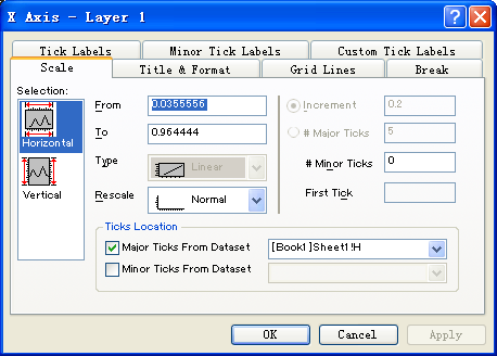 4. 設置#Minor Ticks = 0 & Major Ticks From Dataset: [Book1]Sheet1!H