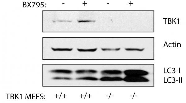 BX795是TBK-1的抑制剂,为了说明BX795在TBK-1 -/-细胞中对自噬没有影响,作者做了个免疫印迹,LC3是自噬活性的标记物。根据这个结果,作者说BX795在TBK-1 -/-细胞中对自噬没有影响。你怎么看?谢谢。我是个菜鸟,大神不吝赐教啊。 fig.JPG |