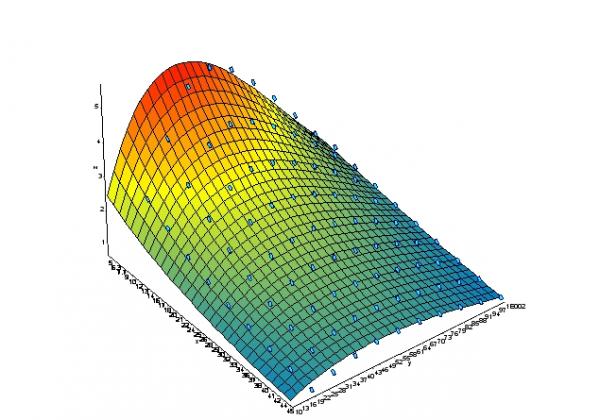 5.00 10.00 2.58 5.00 20.00 4.07 5.00 30.00 5.29 5.00 40.00 5.59 5.00 50.00 5.26 5.00 60.00 4.63 5.00 70.00 3.91 5.00 80.00 3.13 5.00 90.00 2.31 5.00 100.00 1.62 10.00 10.00 2.18 10.00 20.00 3.17 10.00 30.00 4.05 10.00 40.00 4.39 10.00 50.00 4.18 10.00 60.00 3.77 10.00 70.00 3.27 10.00 80.00 2.71 10.00 90.00 2.10 10.00 100.00 1.47 15.00 10.00 1.79 15.00 20.00 2.62 15.00 30.00 3.26 15.00 40.00 3.53 15.00 50.00 3.44 15.00 60.00 3.14 15.00 70.00 2.77 15.00 80.00 2.31 15.00 90.00 1.80 15.00 100.00 1.33 20.00 10.00 1.54 20.00 20.00 2.18 20.00 30.00 2.71 20.00 40.00 2.91 20.00 50.00 2.87 20.00 60.00 2.67 20.00 70.00 2.37 20.00 80.00 2.01 20.00 90.00 1.61 20.00 100.00 1.20 25.00 10.00 1.32 25.00 20.00 1.83 25.00 30.00 2.18 25.00 40.00 2.35 25.00 50.00 2.40 25.00 60.00 2.24 25.00 70.00 2.04 25.00 80.00 1.75 25.00 90.00 1.42 25.00 100.00 1.10 30.00 10.00 1.16 30.00 20.00 1.55 30.00 30.00 1.87 30.00 40.00 2.02 30.00 50.00 2.02 30.00 60.00 1.93 30.00 70.00 1.77 30.00 80.00 1.53 30.00 90.00 1.28 30.00 100.00 1.00 35.00 10.00 1.01 35.00 20.00 1.33 35.00 30.00 1.58 35.00 40.00 1.72 35.00 50.00 1.72 35.00 60.00 1.66 35.00 70.00 1.53 35.00 80.00 1.36 35.00 90.00 1.15 35.00 100.00 .91 40.00 10.00 .91 40.00 20.00 1.16 40.00 30.00 1.37 40.00 40.00 1.48 40.00 50.00 1.50 40.00 60.00 1.45 40.00 70.00 1.34 40.00 80.00 1.20 40.00 90.00 1.04 40.00 100.00 .83 45.00 10.00 .81 45.00 20.00 1.02 45.00 30.00 1.19 45.00 40.00 1.29 45.00 50.00 1.29 45.00 60.00 1.27 45.00 70.00 1.19 45.00 80.00 1.08 45.00 90.00 .94 45.00 100.00 .76 如上数据,怎样用matlab或origin求出曲面方程 |