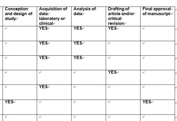 准备投稿的时候,杂志社要求填写一个author contribution form, 表格里列出了几个项目,不知道填写YES呢,还是该仔细填写具体的东西,请各位有经验的帮我看看,谢谢了![]() table.jpg |