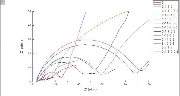镍钴锰酸锂和锂片做成的扣式电池测了一下EIS,如下图: 不同荷电状态和不同倍率充放电之后得到的谱图都不一样,选哪个做等效电路啊??我随便选了一个数据用Zview做了一下拟合和等效电路,下图: 但不知道等效电路画的对不对,我觉得应该是有SEI膜、极化、锂离子迁移等。还有最后导出来的表格里面的数据不知道还要不要用来作图,做出来的是算是拟合过后的奈奎斯特图么? 大侠们帮帮忙吧,谢谢了! |