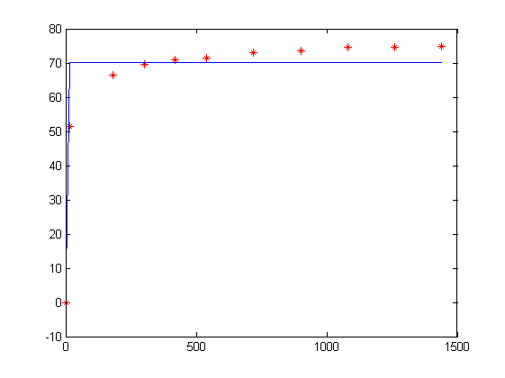 | 已知方程:y=A*e(Bx)+C,e表示自然指数,(Bx)是指数相。其中x=[0,15,180 ,300 ,420, 540, 720 ,900 ,1080,1260,1440],y=[0, 51.5, 66.5, 69.5, 71, 71.5, 73, 73.5, 74.5, 74.5, 75],求A,B,C,请附上matlab拟合的语言及拟合后曲线图。比较急,谢谢 |