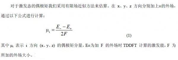 请教各位大牛,怎么计算加有限场F 时TDDFT的激发能? 几何构型优化 和 TD计算的时候都要加外场F吗? 其次,这个F一般都是加多大? 本人是新手,求各位大神给我详细的指导 (gjf文件)~谢谢各位啦~