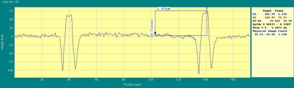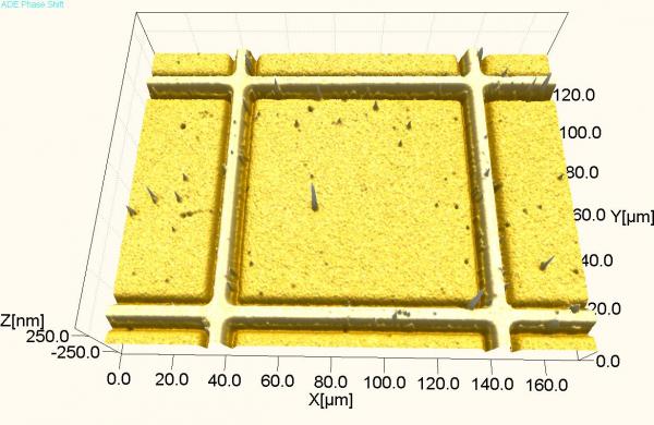 今天对石英板上刻印的微米级金网格进行了3D轮廓测试,结果很奇怪,金格好像嵌入到石英板里面似的,高度线也出现了负的,怎么解释? 谢谢! |