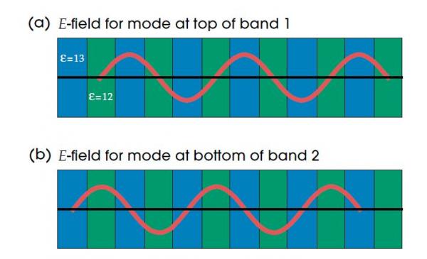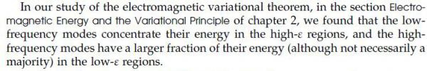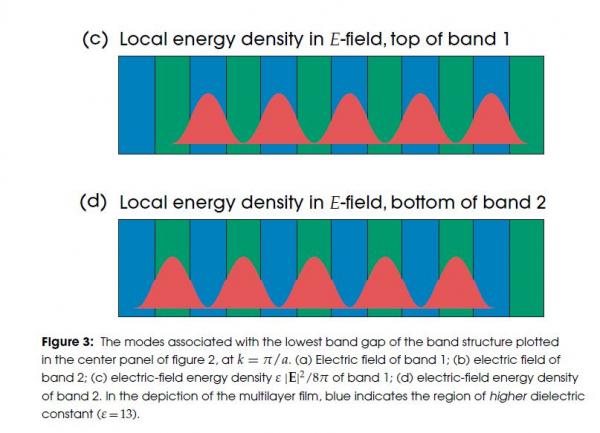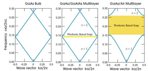 纵坐标表示频率,横坐标表示布洛赫波矢的大小(即波数)。写成图上那种形式只是对这两个量做了归一化,比较方便分析。比如横坐标归一化之后,就一定是限制在-0.5到0.5之间。 斜率其实是dw/dk,物理意义是群速度。但第一个图是均匀介质,dw/dk=w/k,把纵坐标除以横坐标,就可以得到斜率就是折射率的倒数。后面两个图,斜率其实已经有了变化了,但变化不明显,因为这时候的波数k是两种介质的平均值,从第三个图上看的话,空气层的厚度应该比较小,这样平均以后变化仍然不大。在禁带边缘,斜率变平,这里的态密度比较高,群速度比较小。 禁带表示光波以禁带频率入射到光子晶体之后,大部分能量被反射回去,很少能透过,所以称为禁带(禁止通过的带),与固体物理里面的能带类似。 |