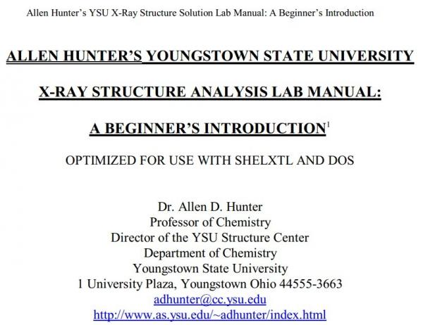 书名为 Allen Hunter\'s YSU X-Ray Structure Solution Guide: A Beginner\'s Introduction 已经查过,无重复,如果你想去豆丁下,链接在这里:http://www.docin.com/p-63752268.html 我没有豆丁币,所以是在以下的网站发邮件求的的http://www.as.ysu.edu/~scic/Downloads.html。 上传上来,纯属想抛砖引玉,希望能得到机会向高人求教,本人是做MOF的,一直做不出好的东西,万分焦虑,理论基础也相当欠缺。希望认识更多的良师益友,一起努力,共同进步,在MOF方面,拥有属于自己的美好未来。 545.jpg sa.jpg 未命名.jpg |