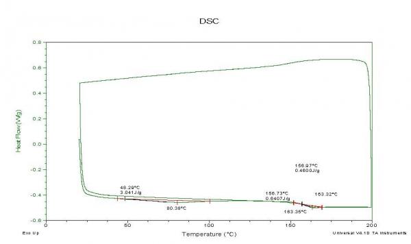 DSC一般都要消除热历史,你的样品TG在155左右,如果是单一聚合物的话,80左右的微弱吸热峰更可能是溶剂什么的没除干净的原因!