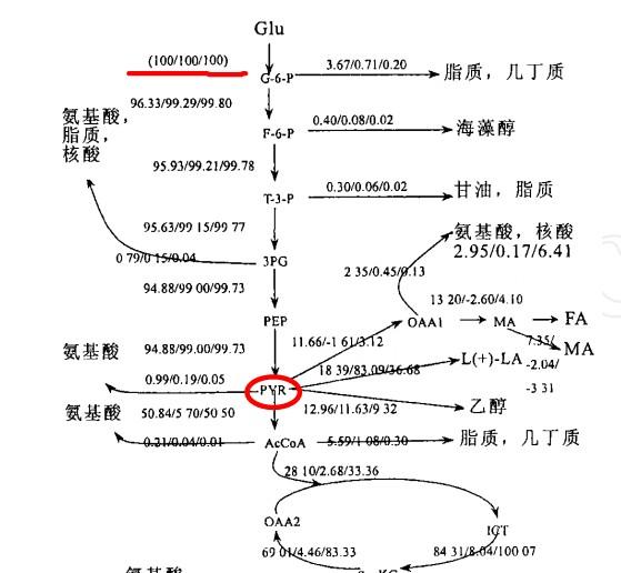 你好 再请教你一下啊 关于这个问题我最近又困惑了 因为看的文献上说的不太一样 对于上面那个图 从F6P往下有95.93生成T3P , 0.40生成海藻醇 是理解成为进入F6P的96.33mol的葡萄糖有95.93生成了T3P ,0.40mol生成了海藻醇吗?