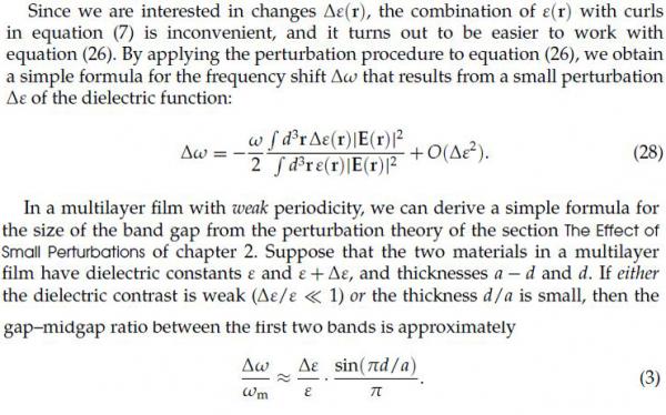 教材里面根据量子力学微扰理论得到了公式(28),但是对电磁波求解时我怎么也得不出(3)式。 根据假设,在多层膜介质中,光能无损耗而且是线性的。那么公式(28)的分子、分母的积分范围是多少?如果面积都是整个无限膜介质,那么微扰能量/总能量=微扰厚度a/总厚度d了? 但是它的解貌似更加是通解,谁能解释一下积分的方法?多谢各位了! 22.jpg |