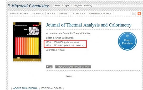 ISSN即国际标准期刊号 (International Standard Serial Number,简称 ISSN),是根据国际标准组织1975年制订之 ISO-3297 的规定,由设于法国巴黎的国际期刊资料系统中心 ( International Serial Data System - ISDS International Centre)所赋予申请登记的每一种刊物一个具有识别作用且通行国际间的统一编号。 “期刊”是指任何一系列定期或不定期连续出版的刊物,它们通常以一定的刊名发行,以“年月日”,“年月”或数字标明卷、号、期数。市面上常见的期刊、杂志、丛刊、年刊等大都属于国际标准期刊号的编号与编码范围。每一种期刊在注册登记时,就得到一个永久专属的 ISSN,一个 ISSN 只对应一个刊名;而一个刊名也只有一个 ISSN。 所以当该刊名变更时,就得另申请一个 ISSN。如果期刊停刊,那么被删除的 ISSN 也不会被其它期刊再使用。 每组 ISSN是由八位数字构成,分前后两段,每段四位数,段与段间用“-”相连,其中后段的最末一数字为检查号, 如:ISSN 0211-9153 ISSN有印刷版和电子版两类,你这里所说的ISSN就是印刷版的,而E-ISSN就是Electronic International Standard Serial Number (简称E-ISSN)。 比如期刊Journal of Thermal Analysis and Calorimetry(主页http://www.springer.com/chemistr ... istry/journal/10973),就出现以下情况,ISSN号分别标有print version和electronic version两种情况。 |