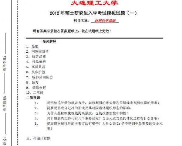 【真题预测】大连理工大学材料科学基础真题预测