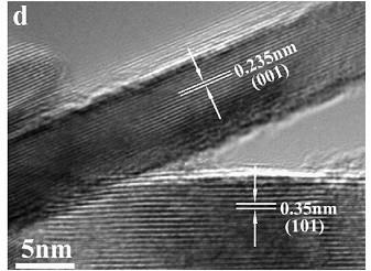 请教各位虫友,在做锐钛矿TiO2的高分辨TEM时,文献中都会量出(001)面的面间距为 0.47nm,但是根据PDF卡片JCPDS 21-1272中并没有(001)的面间距,只提供了(004)面面间距为0.2378nm,困惑怎么计算出(001)面间距的。