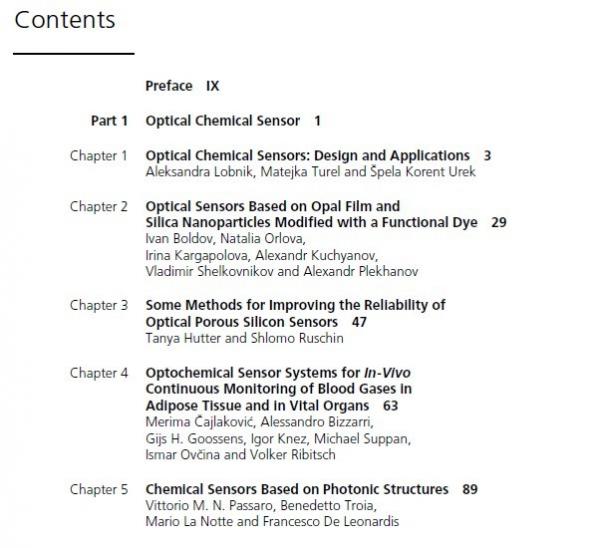 Advances in Chemical Sensors Edited by Wen Wang, ISBN 978-953-307-792-5, Hard cover, 358 pages, Publisher: InTech, Published: January 20, 2012 The chemical sensor plays an essential role in the fields of environmental conservation and monitoring, disaster and disease prevention, and industrial analysis. A typical chemical sensor is a device that transforms chemical information in a selective and reversible way, ranging from the concentration of a specific sample component to total composition analysis, into an analytically useful signal. Much research work has been performed to achieve a chemical sensor with such excellent qualities as quick response, low cost, small size, superior sensitivity, good reversibility and selectivity, and excellent detection limit. This book introduces the latest advances on chemical sensors. It consists of 15 chapters composed by the researchers active in the field of chemical sensors, and is divided into 5 sections according to the classification following the principles of signal transducer. This collection of up-to-date information and the latest research progress on chemical sensor will provide valuable references and learning materials for all those working in the field of chemical sensors. 1568.jpg 未命名.jpg [ 来自科研家族 小木虫青春动力 ] |