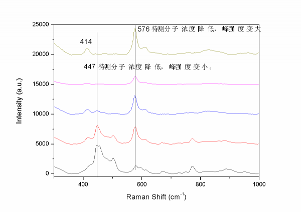 你应该做一下Ag基底的背景,看看在没有吸附分子的时候是否有这个峰。一般来说,银和其他分子作用时候,出来的特征峰在更低的波数范围。 做一下分子普通拉曼图,看看是否有峰在580 cm-1附近,如果有的话,它应该是你待测分子的特征峰,吸附在Ag上后,挪到了576cm-1. 那个447cm-1特别像是因为你浓度太大而检测到普通拉曼峰,而不是SERS峰,如果是的话,那就是你的浓度太浓干扰了SERS检测。 还有一个可能就是580 cm-1来源于别的分子污染,是和你待测分子一起在溶液里边。两个家伙是竞争吸附关系,一个强了,另一个就弱了。 |