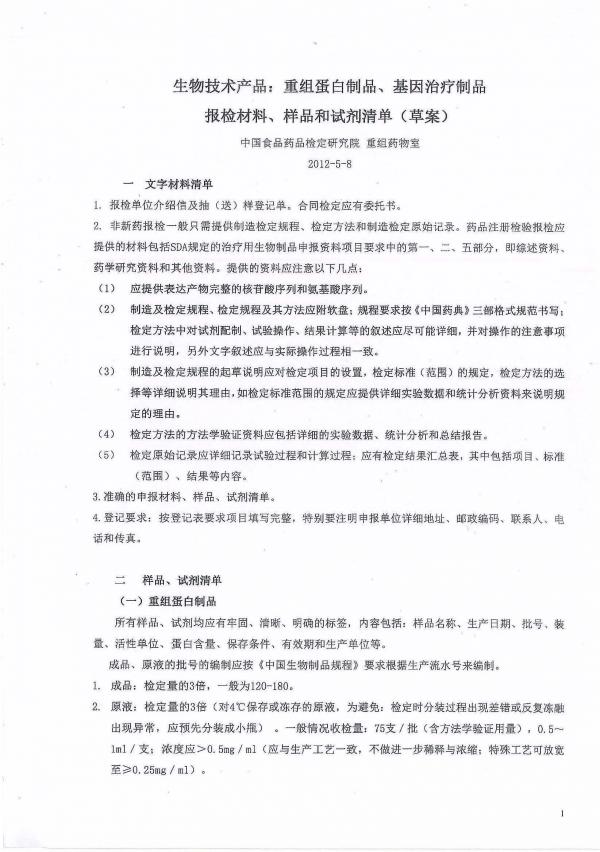 生物技术产品中检所送样清单-20120508最新版本