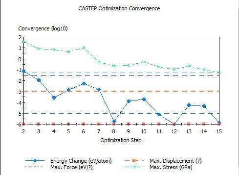 请问这种情况怎么解决啊,调了各种参数,Max.force和max.Didplacement还是不收敛而且根本没有这两个参数的曲线? 而且在castep文件中也只有收敛的这两个参数,另外两个至少也要有个NO把? 未命名.jpg 2.jpg |