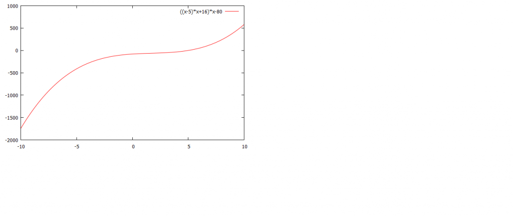 #include #include float f(float x) { return ((x-5)*x+16)*x-80; } float xpoint(float x1,float x2) { return (x1*f(x2)-x2*f(x1))/(f(x2)-f(x1)); } float root(float x1,float x2) { float x,y,y1,y2; y1=f(x1);y2=f(x2); do { x=xpoint(x1,x2); y=f(x); if(y*y1>0) {y1=y;x1=x;} else {x2=x;y2=y;} } while (fabs(y)>0.00001); return x; } void main() { float x,x1,x2,y1,y2; do { printf("input x1,x2:" ;scanf("%f,%f",&x1,&x2); y1=f(x1); y2=f(x2); } while(y1*y2>0); x=root(x1,x2); printf("A root is %f\n",x); } |