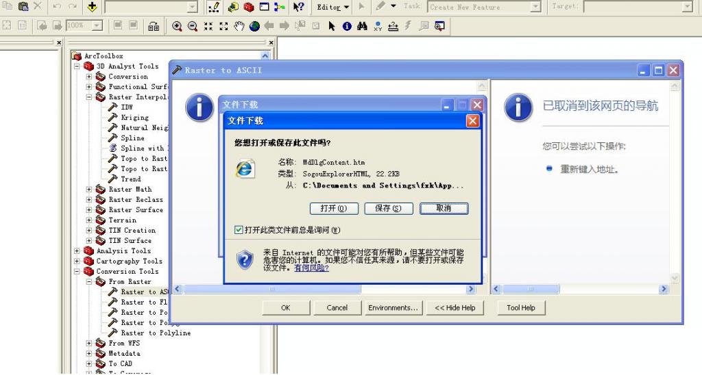 以前使用arcgis9.3都是正常的。一段时间没用,某一天来用,发现点击arctoolbox里的某一工具,出现文件下载的对话框,如下图。无论点击下载还是取消,都貌似没有用。如何解决呢? 1.JPG 2.JPG |