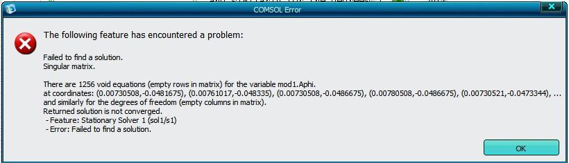 COMSOL AC/DC模拟出错,显示出现奇异矩阵