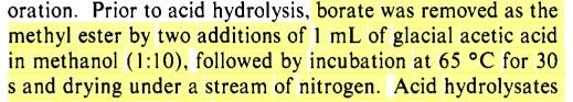 我要检测肉中的一种特殊氨基酸,在处理样品的时候,我加入了NaBH4和硼酸钠缓冲液,后来加入了6M的HCl进行酸水解,这样过量的NaBH4应该都转变成硼酸钠了吧?请问水解后怎么才能除去过量的硼酸钠呢? 我查阅了文献,文献中先是样品吹干后,再用冰醋酸/甲醇(1:10),再吹干就可以除去硼酸钠,请问各位这样可行吗? 谢谢大家了 ![]() ![]() ![]() 未命名.jpg |
