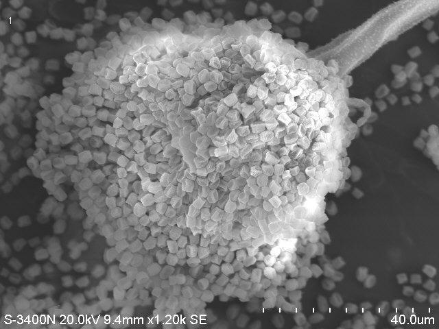 我觉得这与曲霉孢子梗形状很像,都是圆形的,放射状发生的,至于你拍到的那个很怪异的东西,我不知道是什么,可能是拍照的时候菌丝什么的变异或者纠结什么的。我传的第一张照片就是一株我用ITS序列鉴定为亮白曲霉的真菌在光学显微镜下的菌丝形态,第二张是一株我用ITS序列鉴定为黄曲霉的真菌在扫描电镜下的菌丝形态。