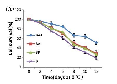 图上是低温处理条件下大肠杆菌的存活率,随着低温处理时间的延长,存活率越来越低。存活率是等于当次涂板数出的菌落数除以未经低温处理涂板数出的菌落数。而每一次的菌落数都是由至少三个数算出来的平均值。不知道这样添加误差线的话该用什么值来添加喃?我想做一个跟下图基本一样的图?不知道这个图里的误差线是怎么做出来的啊? 误差线.jpg |