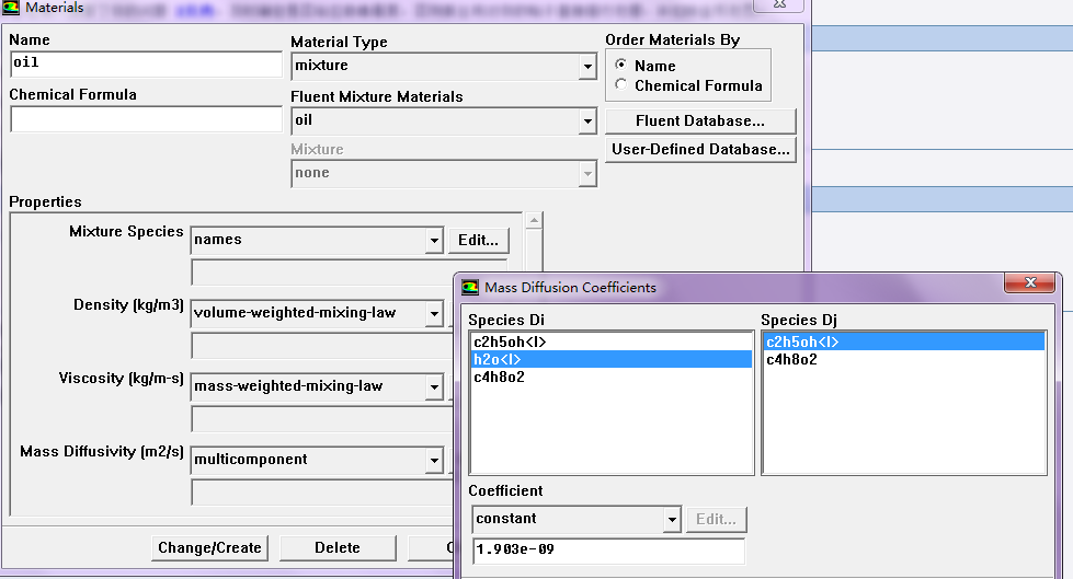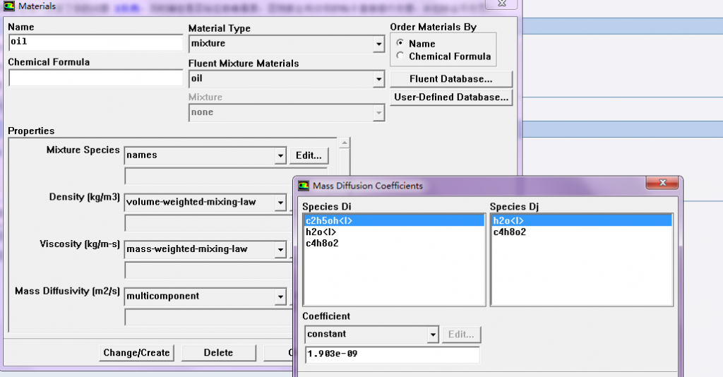 怎么在fluent里面设置mass diffusivity /multicomponent 的时候老是自动出现Dij = Dji 这是怎么回事呢? 比如说我的油相是三物质:乙酸乙酯(0.9)乙醇(0.05)水(0.05) 怎么老是出现在油相里:D醇,水 =D 水,醇 ;;D醇,酯=D酯,醇 呢??请教一下这个具体应该这么设置,谢谢各位呀!! 1.png 2.png 1.png |