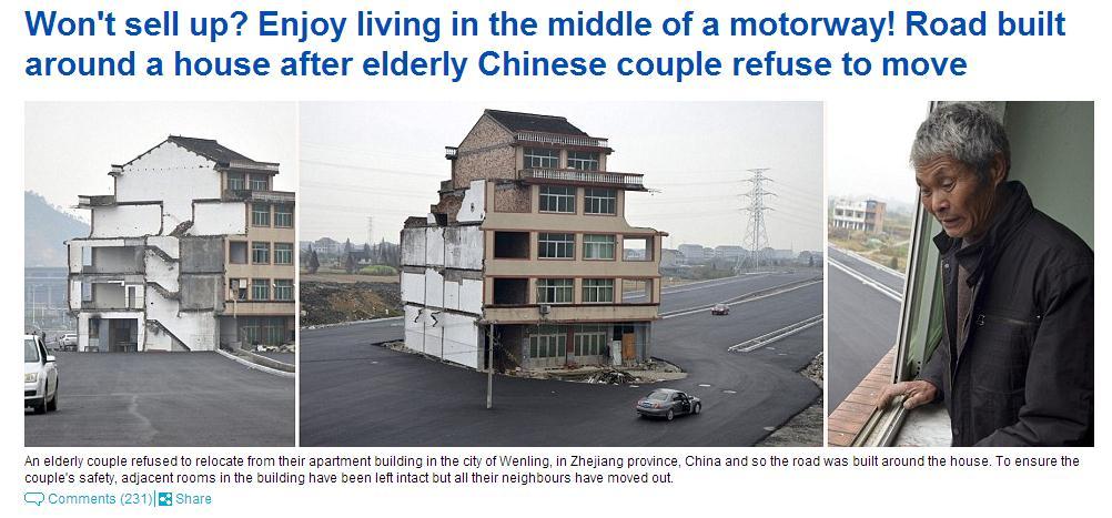 In my opinion, that's nothing. And as the house is situated in the middle of the road, there should be a big warning on the wall and light in the night for the cars, trucks and motorbikes passing by; and when these motor vehicles enter the area around, they should slow down in order not to disturb the old couple. Besides, the daily safty problem should be considered. |