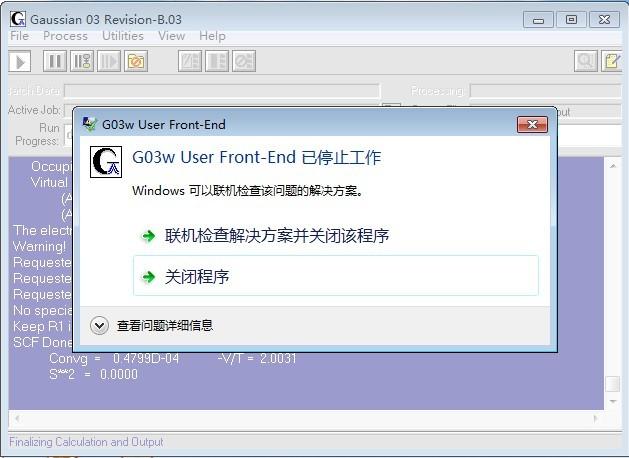 我的电脑是win7系统,才刚刚学高斯,用里面的exercise 2.01里面计算甲醛的单点能,但是只要一运行,高斯的就止了,而运行其中其他的又正常,这是为什么呢,求大神解答 如图