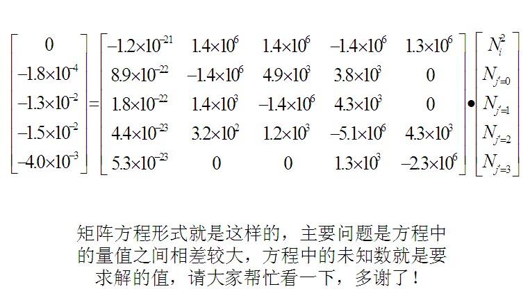 谢谢您的解答,非常感激! 我之前也用过雅克比迭代和高斯赛德尔迭代进行过求解另外一个类似的方程,但是没有收敛,不知道是不是初值选择的问题,麻烦您帮忙看下!谢谢!方程如下: A=[-1.070906744447462E-017 244564571.598802 303866255.019473 303856255.019473 303756255.019473 ; 9.735515836938967E-017 -437040200.438244 546168396.621813 415770404.263350 0.000000000000000E+000 ; 1.947103215071310E-017 157778358.747585 -986775896.684545 473345946.492110 0.000000000000000E+000; 4.867758037678274E-018 34697270.0918581 136741245.043259 -1333413850.81819 473345946.492110 ; 5.841309406796348E-018 0.000000000000000E+000 0.000000000000000E+000 136741245.043259 -778102201.511583 ]; b=[ 104348331231.704 -2072871.66710357 -154296552.906917 -178403143.022063 -48501206.8009638 ]'; |