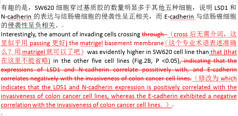 有趣的是,SW620细胞穿过基质胶的数量明显多于其他五种细胞,说明LSD1和N-cadherin的表达与结肠癌细胞的侵袭性呈正相关,而E-cadherin与结肠癌细胞的侵袭性呈负相关。我的翻译如下,但总觉得不好,请各位高手指点! Interestingly, the amount of invading cells crossing through the matrigel basement membrane was evidently higher in SW620 cell line than in the other five cell lines (Fig.2B, P <0.05), indicating that the expressions of LSD1 and N-cadherin correlate possitively with, and E-cadherin correlates negatively with the invasiveness of colon cancer cell lines. |