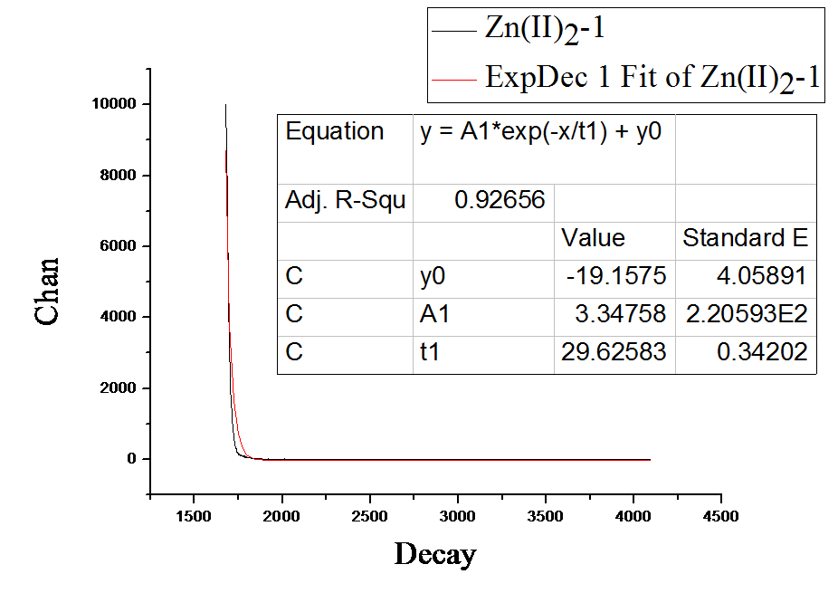 这是测的一个与锌配位的化合物,没有锌配位的时候只有一个寿命(图片6化合物1),1与锌配位后有两个寿命,第二个寿命只占百分之四,而且比第一个寿命小一个数量级,图片四和五是与锌配位后用两种函数拟合后的结果,是不是不准确啊,还是我的物质不纯导致的