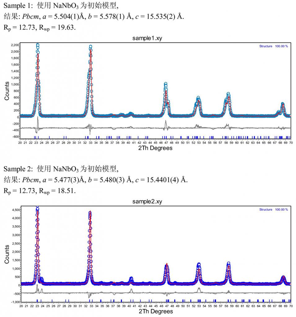 谢谢啊,我用MAUD算的时候选择的也是NaNbO3作初始模型,我搜到铌酸钠的四种参考结构,选择了其中较符合的两种,其一就是跟前辈你选的差不多吧,原模型铌酸钠的晶格参数a,b,c分别是5.504, 5.568 和15.52(具体参数见附件铌酸钠1);后来我发现另外一个铌酸钠的结构(晶格参数a,b,c分别是5.566, 15.520和5.506,见附件铌酸钠2)似乎更符合样品的结果, 所以我就疑惑了,前辈您是怎么确定选来作初始模型的铌酸钠的结构的,每个结构基准晶格参数就不同嘛。
