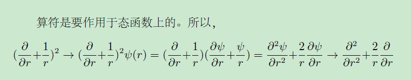 算符p少个下标r, 应当是p_r, 右边应当是p^2, 而且方便起见, 已置 hbar=1, 自然单位制. 量子力学里的算符后面一般紧跟波函数. 证明 -1/r^2*(r^2*psi(r, theta, phi) ' ) '= p(p(psi (r, theta, phi) ) ) 即可, ' 表示 ...