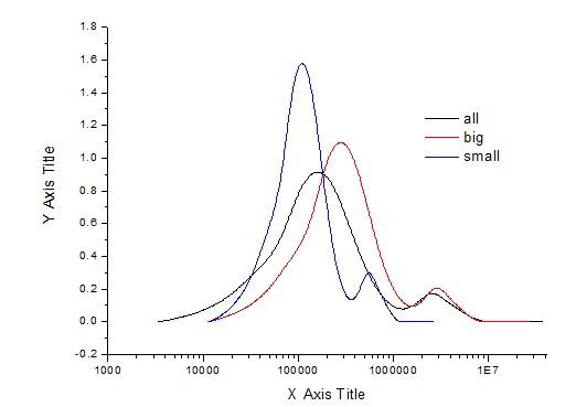 图形中,其中的"all"代表选用整个分子量范围(包括大小峰)做积分,“small”代表选用小分子量范围做积分,“big”代表选用大分子量范围做积分。 由于GPC自带函数的内退,不管选用大分子量部分,还是选用小分子量部分,都会对整个范围积分,想大家请教如何处理才能区分开大分子量部分与小分子量部分? 或者是碰到类似情况该如何处理?谢谢啦 {_OO5(GG2%48V3N~0ADXM`C.jpg |