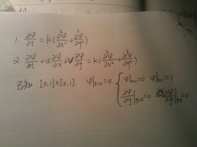 一个是二维热传导方程,一个是二维扩散对流方程!!!找本偏微分方程求解的书去看看!!用有限差分法求解!!!