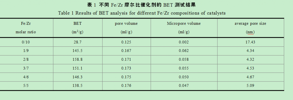 表1 不同Fe/Zr摩尔比催化剂的BET测试结果